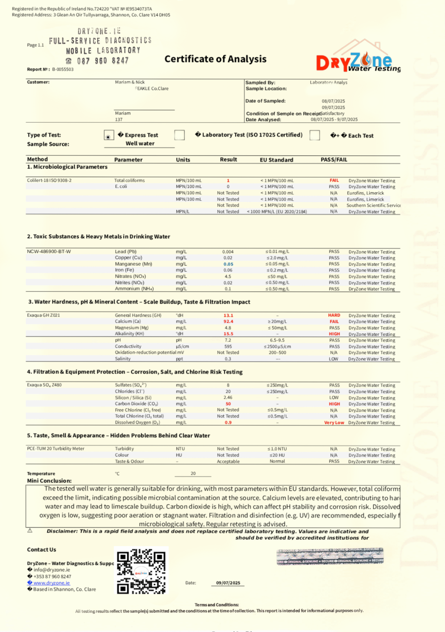 At DryZone, we provide professional well water testing directly at your home – no shipping, no waiting weeks. Across Clare and Limerick, our mobile laboratory delivers same-day results for over 30+ parameters, including bacteria, nitrates, heavy metals, hardness, chlorine, turbidity, radon, and radiation