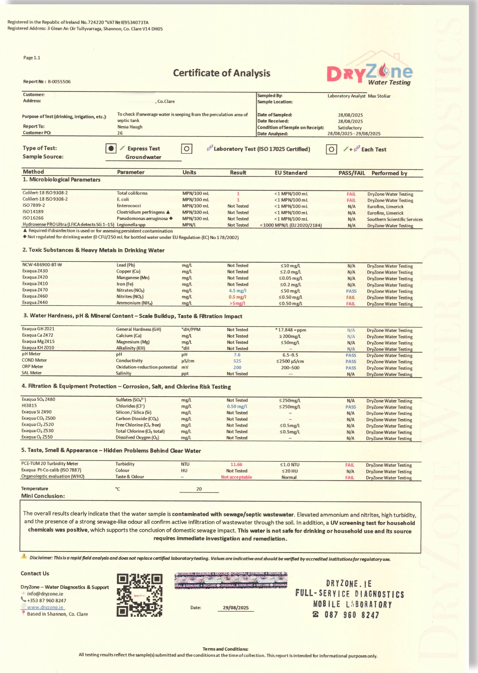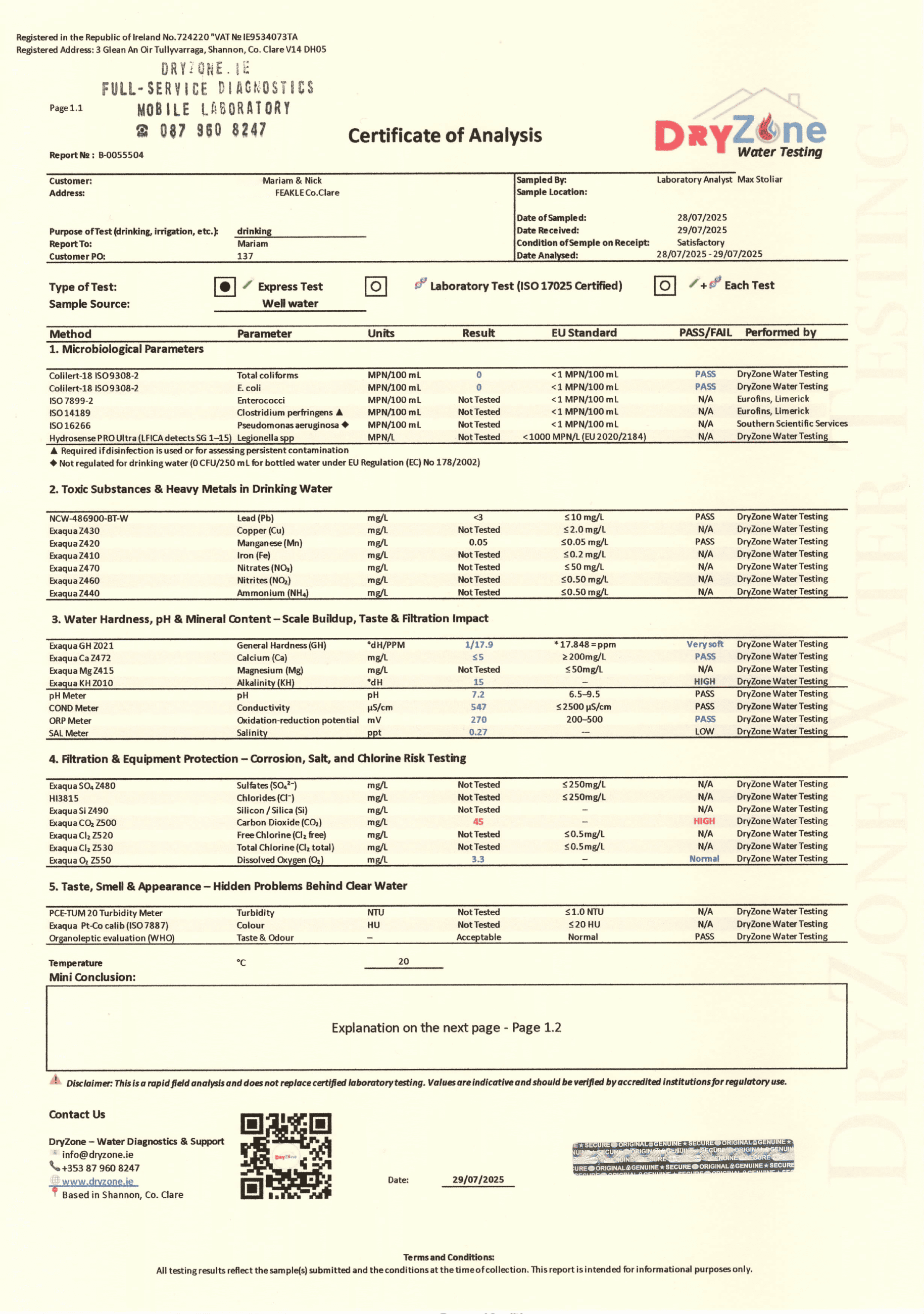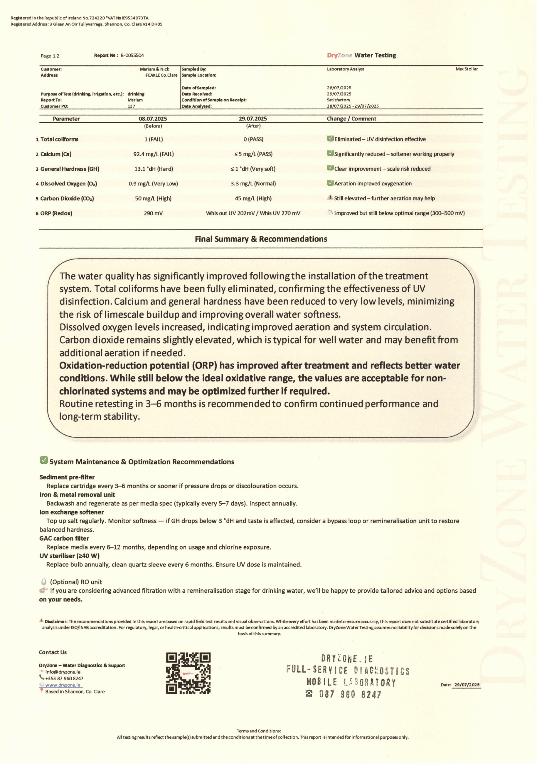 Every client receives a Certificate of Results, and on request, a Recommended Solution tailored to their water.